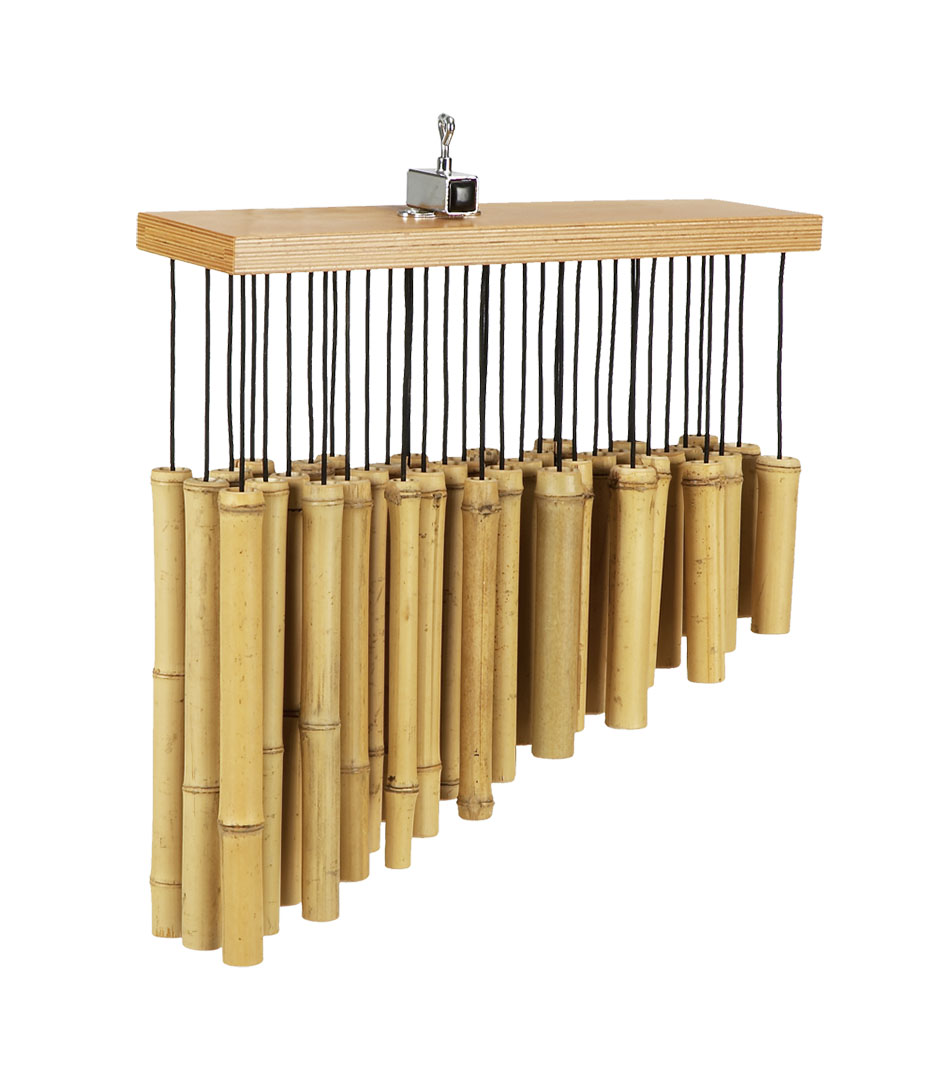 Bamboo tubes of different length are hung up on tearproof nylon cords ,mounted on a sturdy laminated beech plate. |
