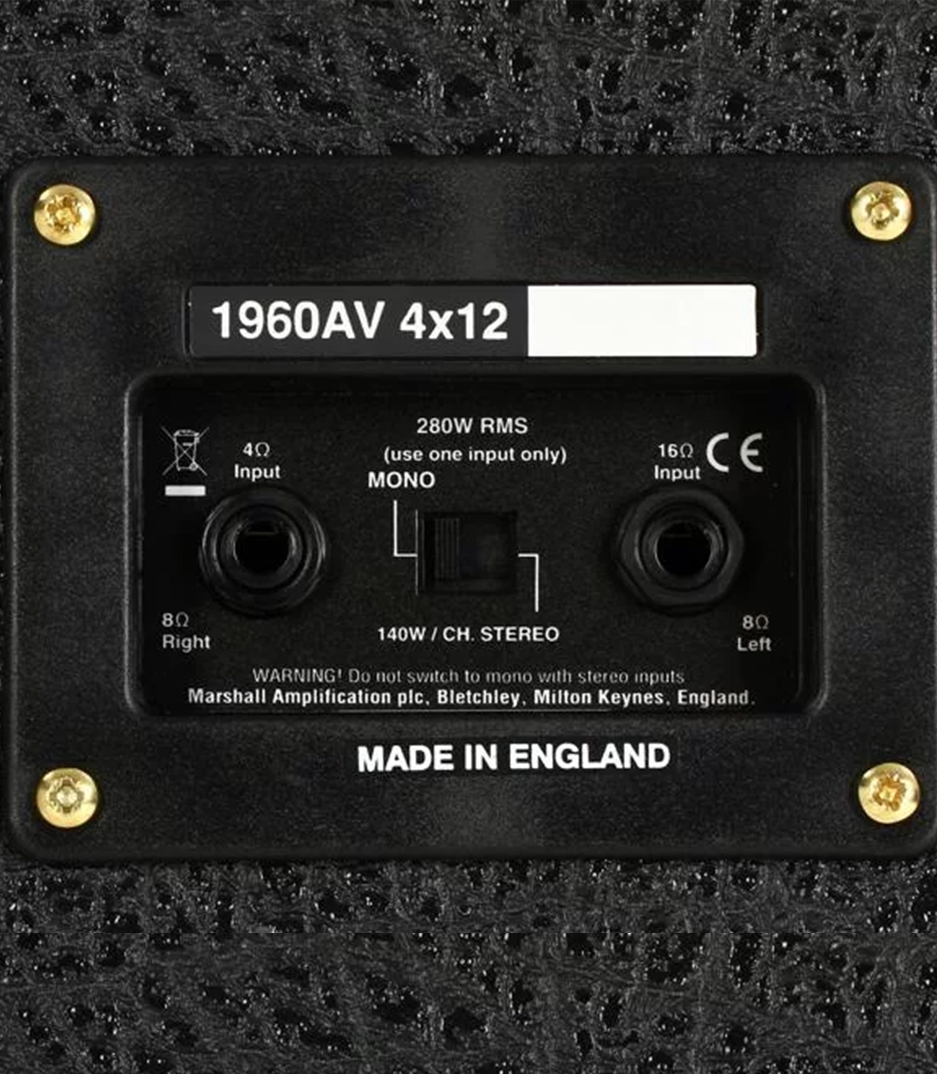Guitar speaker cabinet 4 x 12″, vintage-angled the marshall 1960av is a” vintage” version of the famous 1960a 4×12″ cabinet, loaded with four celestion g12-vintage (also known as vintage 30) speakers. Marshall’s 1960av cab can be operated in mono (4 or 16 ohms) or stereo (8 ohms per side). It has a maximum power input of 280w rms
