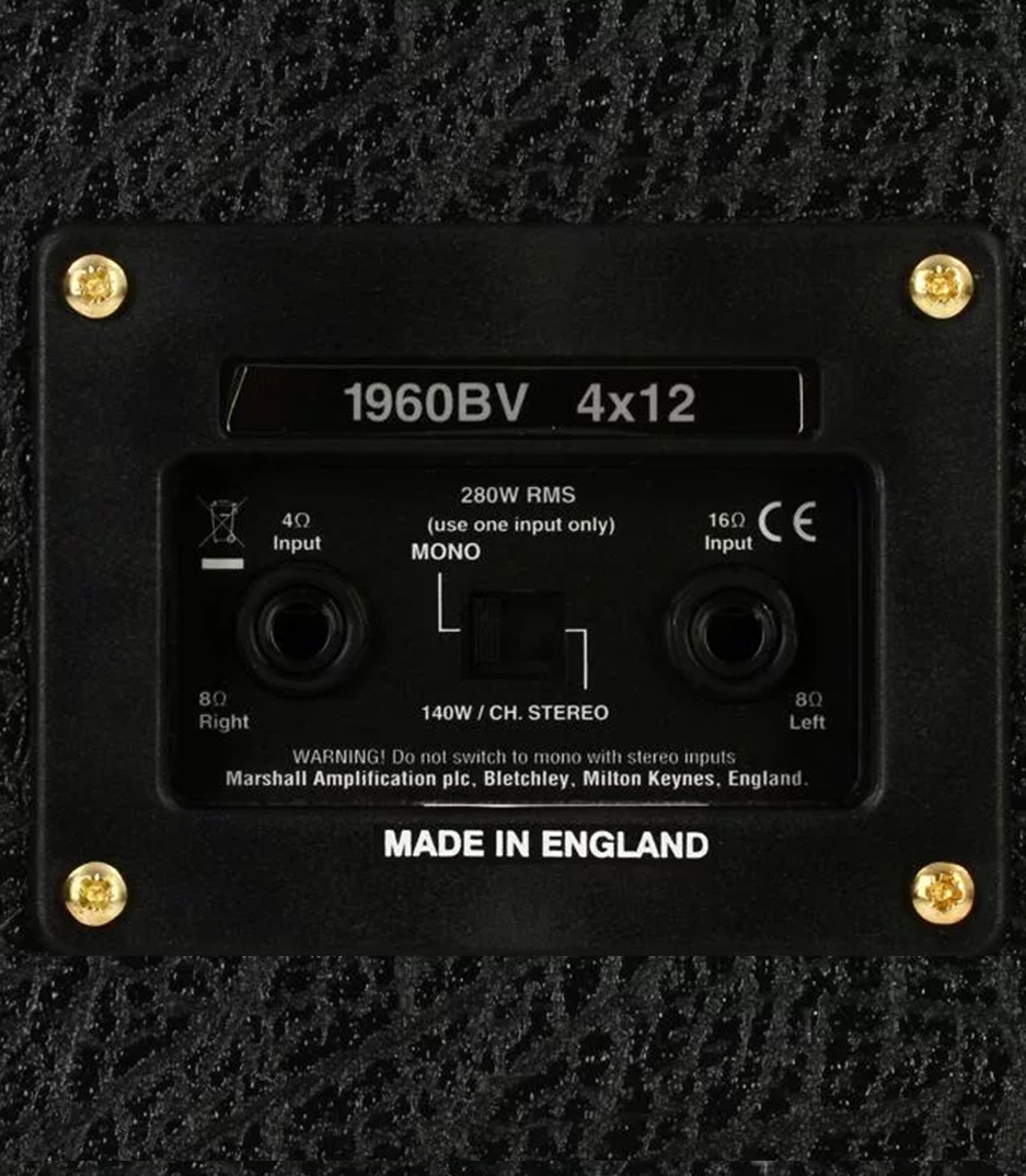 Guitar speaker cabinet 4 x 12″, vintage-straight the marshall 1960bv is a” vintage” version of the famous 1960b straight 4×12″ cabinet, loaded with four celestion g12-vintage (also known as vintage 30) speakers. Marshall’s 1960bv cab can be operated in mono (4 or 16 ohms) or stereo (8 ohms per side). It has a maximum power input of 280w rms
