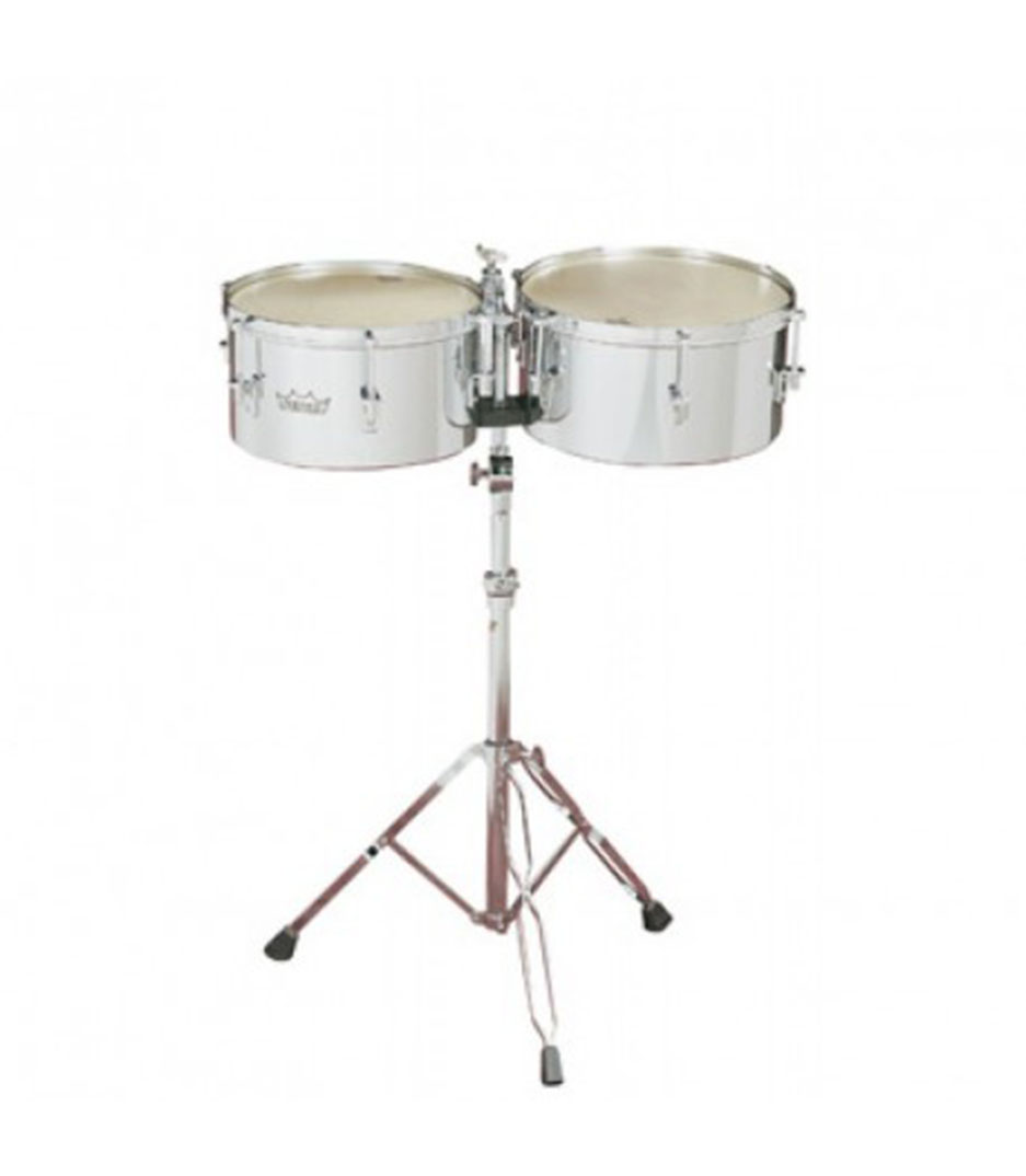 Remo timbales come in the professional-grade key-tuned valencia series and feature steel shells, renaissance heads, and come with stands