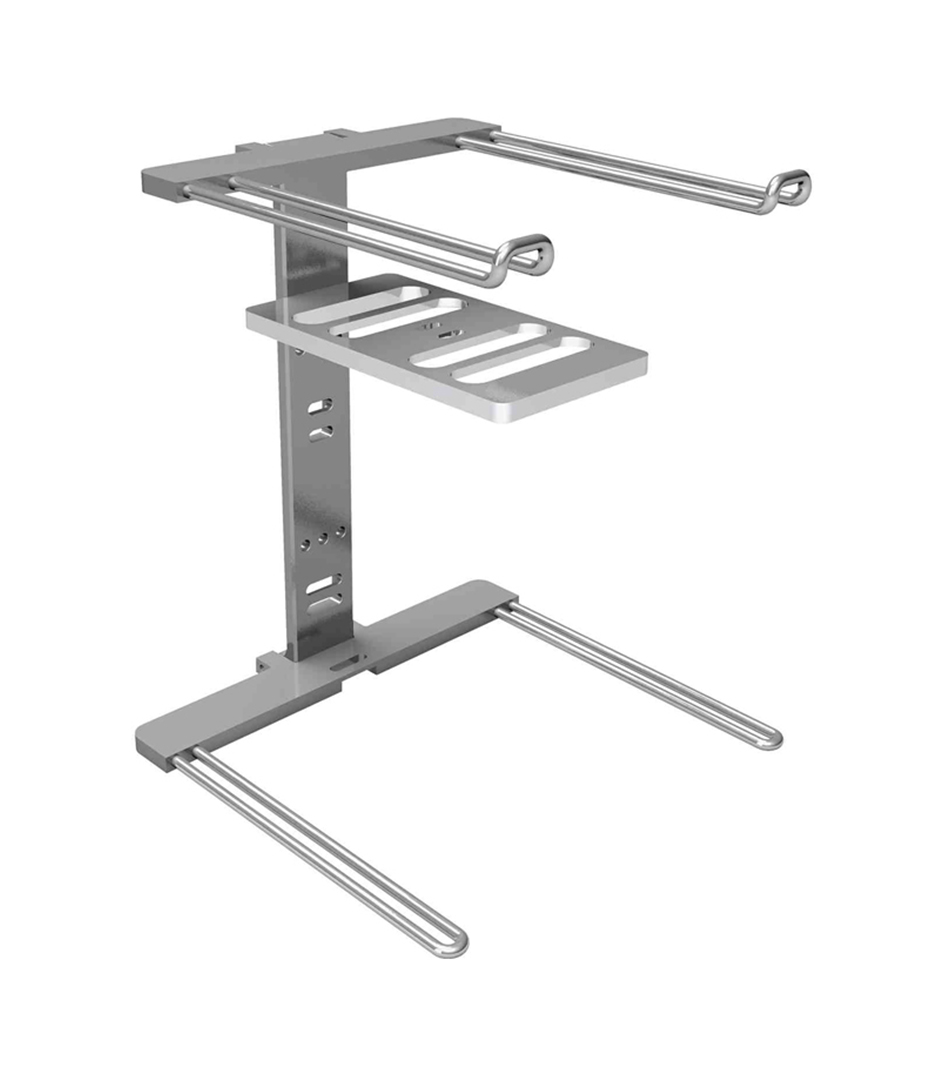 The uberstand laptop stand is an essential tool for the traveling laptop dj / musician. Most dj booths and performance venues were not designed to accommodate a laptop, which creates a hassle for the dj in many spaces. The uberstand alleviates this issue. Folded, the uberstand is the perfect travel companion to your laptop. Unfolded, its striking industrial design comes to life and safely elevates your laptop above your work space while providing a specially crafted shelf for your external hard-drive