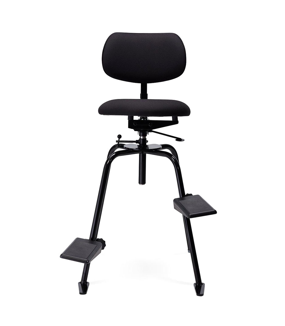 Four-legged base of tubular steel, diameter 25 x 2 mm, black or chrome. Equipped with anti-tip safety advice. Folding footrests of pur foam, adjustable in height and direction. Locking nut seat height adjustment. Seat and backrest of laminated beech veneer come in natural or stained, finished with clear dd lacquer. In the upholstered seat version, the round seat with ventilation holes is standard, non-swivel, with a notch integrated for right leg in pu foam upholstery. Seat is adjustable in angle, backrest adjustable in height and angle and is covered with black plastic