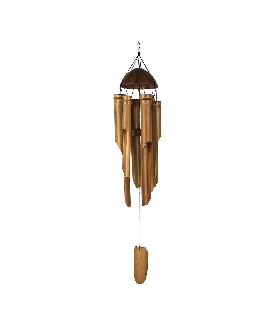 Mellow, relaxing tones produced by hand-tuned bamboo chimes. Chimes hang from an polished coconut shell top. Naturally weather resistant and strung from durable nylon cord. Hand-made using renewable resources