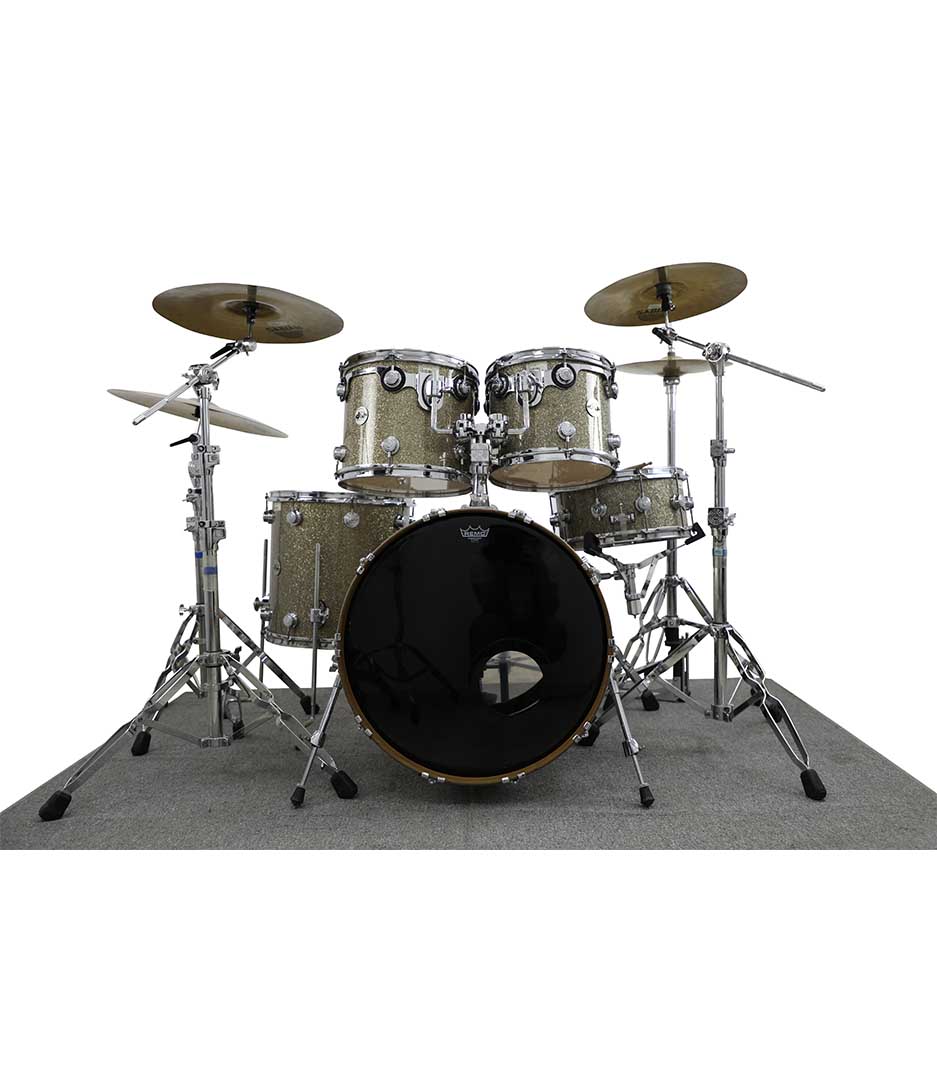 DW Collectors; Broken Glass-5pc Drumkit. Bass drum, floor tom, 2 rack toms, snare, ride, 2 crashes and hi-hat cymbals. Shell sizes are customizable upon request