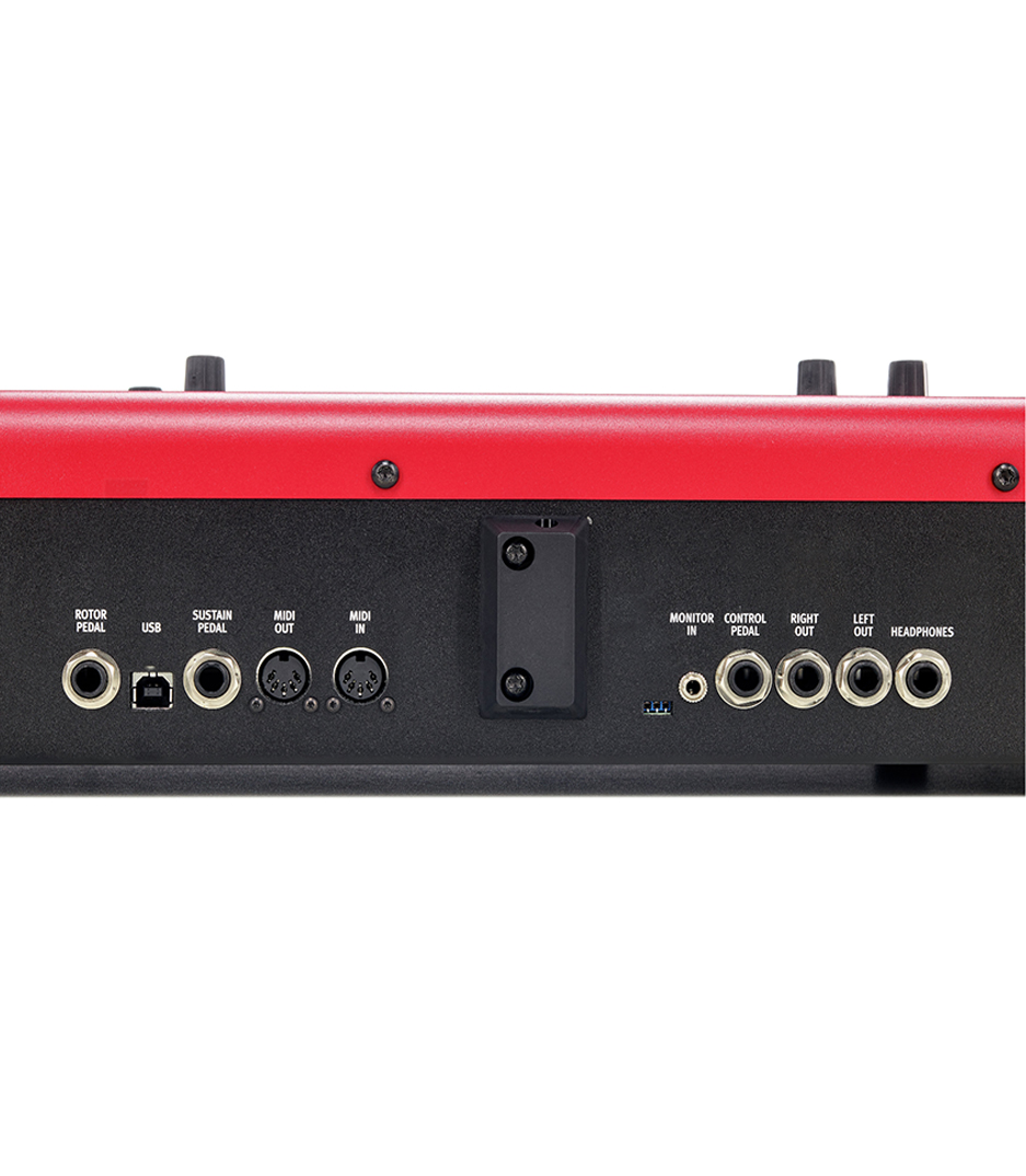 2 audio outputs l & r (1/4") 1 monitor input (1/8") 1 headphone output (1/4") 1 sustain pedal input (1/4") 1 control pedal input (1/4") 1 rotary speaker speed switch pedal input (1/4") midi in midi out usb (type b) |