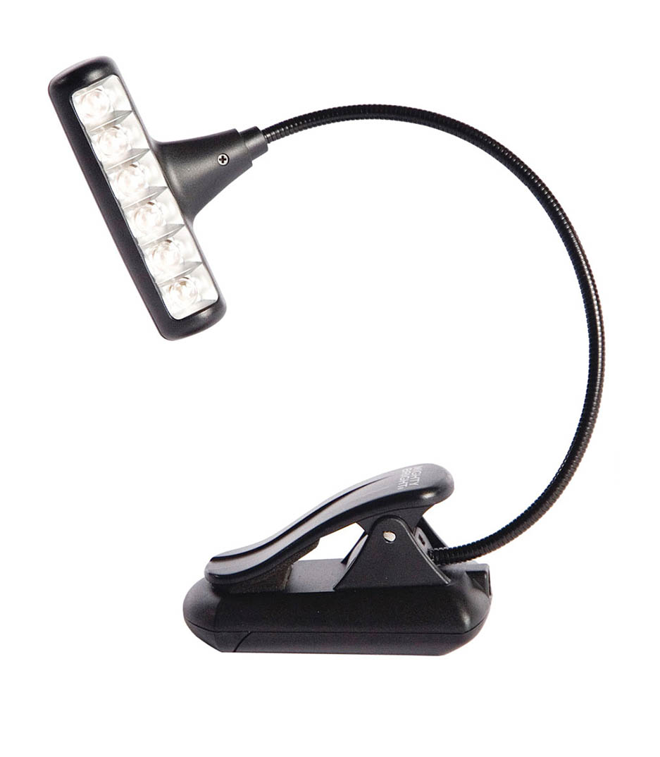 Multi-purpose, mini music stand light with 6 extra bright, light emitting diodes. The hammer head is battery powered as standard or optionally with an external power supply. Two levels of brightness.