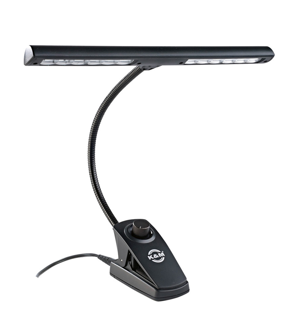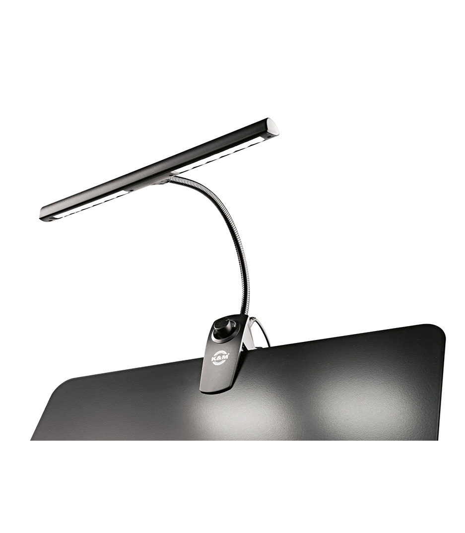 Equipped with 12 energy saving and durable leds, guarantees optimal music desk lighting. The re-designed light can now be operated with batteries or with a power supply. The brightness is adjusted using a variable dimmer switch. The flexible gooseneck ensures that the light is ideally positioned. A handy clip provides for easy attachment to all music desks with a thickness of 25 mm
