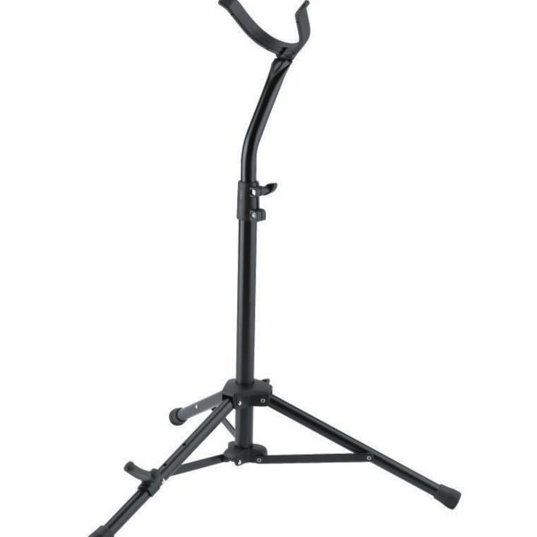 Compact, stable aluminum violin stand. Fully height adjustable instrument support arms can be adjusted to fit a variety of violin sizes. The instrument support arms are lined with soft plastic material to protect the instrument finish. Height adjustment using a non-slip clamping lever. The solid yoke has a safety lock to provide extra protection. Integrated bow holder