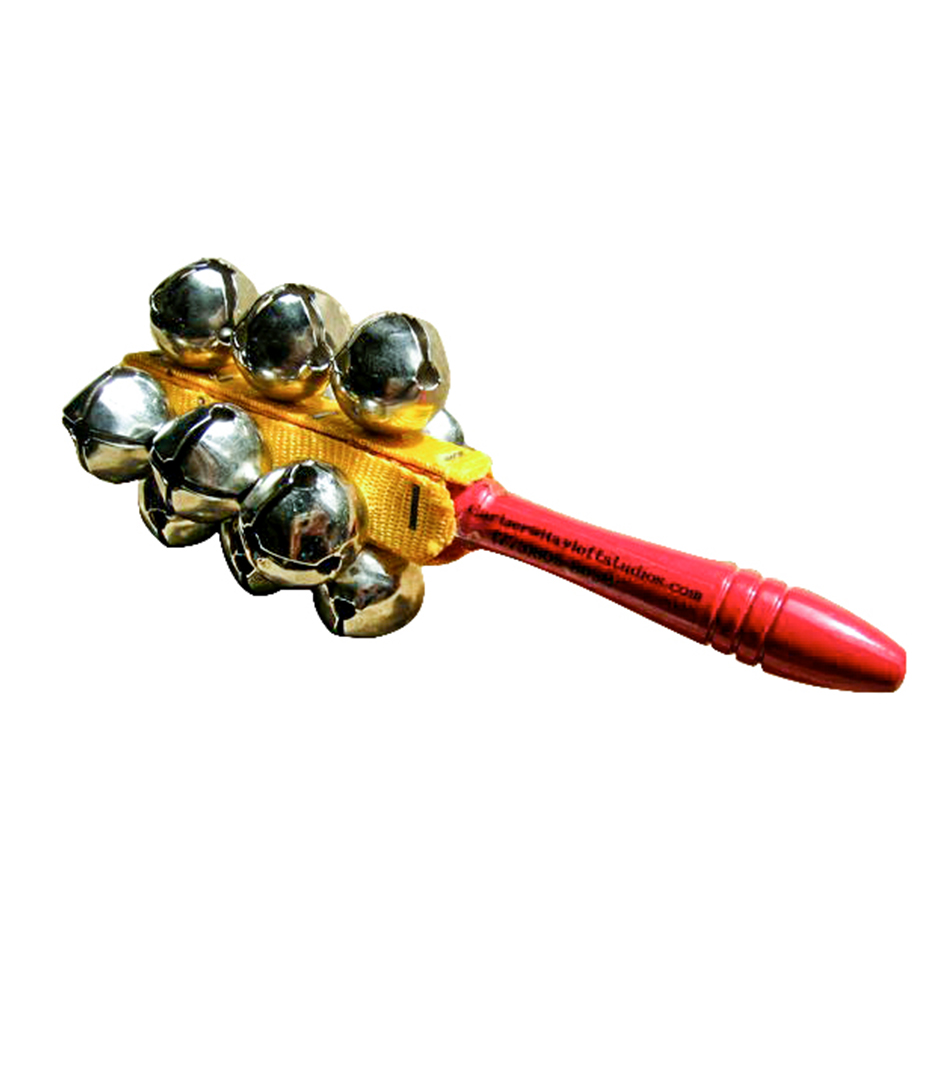 12 bells attached to fabric strips and mounted to a wooden handle |
