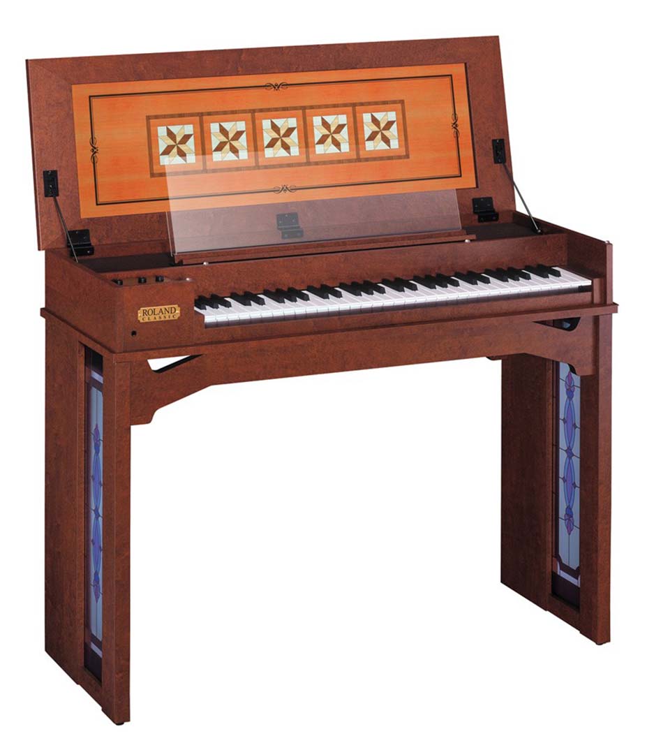 the c-30 is elegant and classy, and suitable for any size room. It allows images, paintings, or other artistic elements to be affixed to the keyboard lid and side panels (see accessories). Roland provides a variety of image patterns, including paintings and stained-glass-type panels. Together with its matching stand (included) the c-30 is a gorgeous addition to any home or music venue
