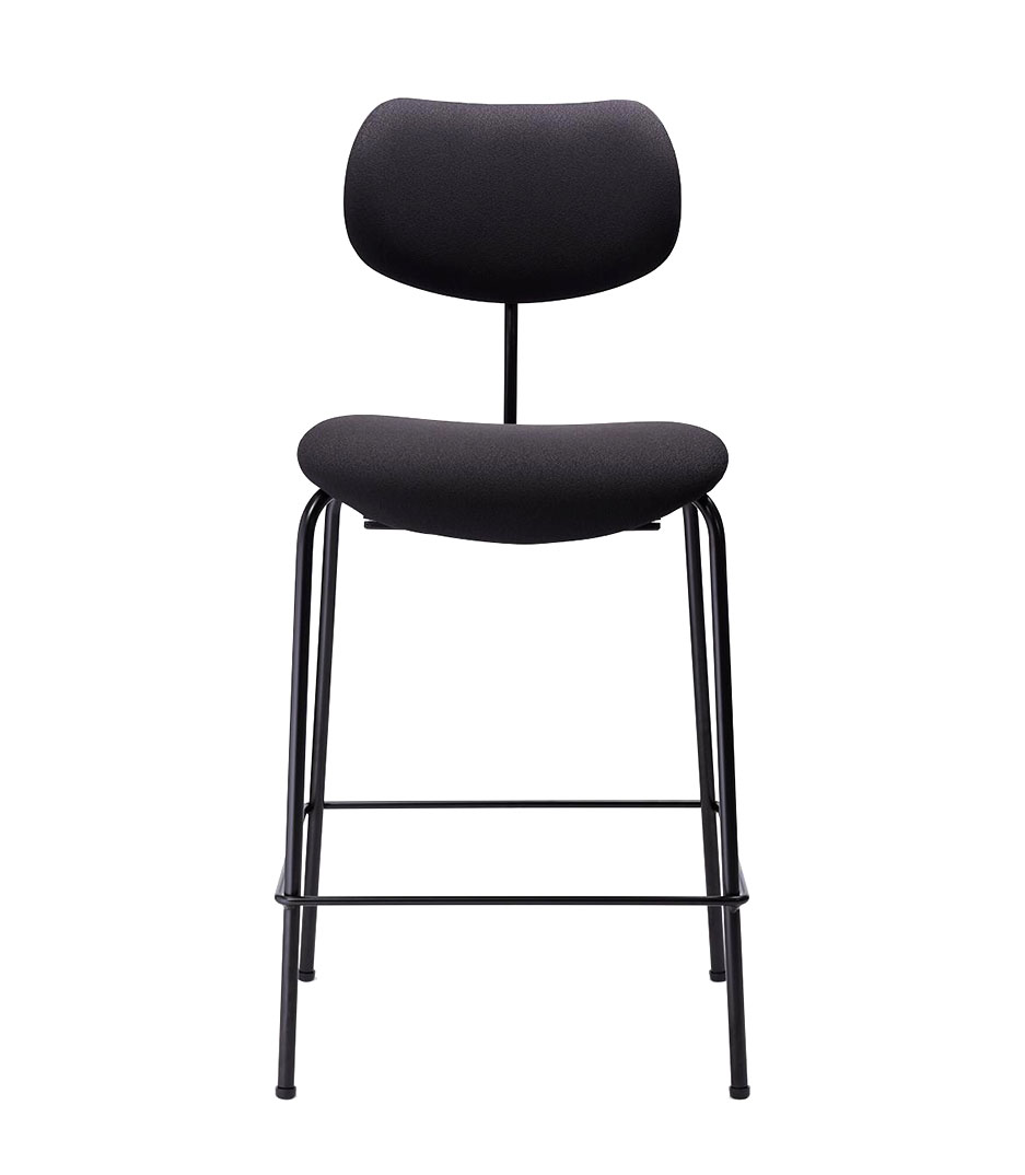 Four-legged frame of tubular steel, diameter 18 x 2 mm, black or chrome. Foot bar for leg support. Seat and backrest of laminated beech veneer come in natural or stained, finished with clear dd lacquer. In the upholstered seat version, ventilation holes are standard. Rubber fiber material for better comfort, foam at a nominal charge. Backrest is covered with black plastic