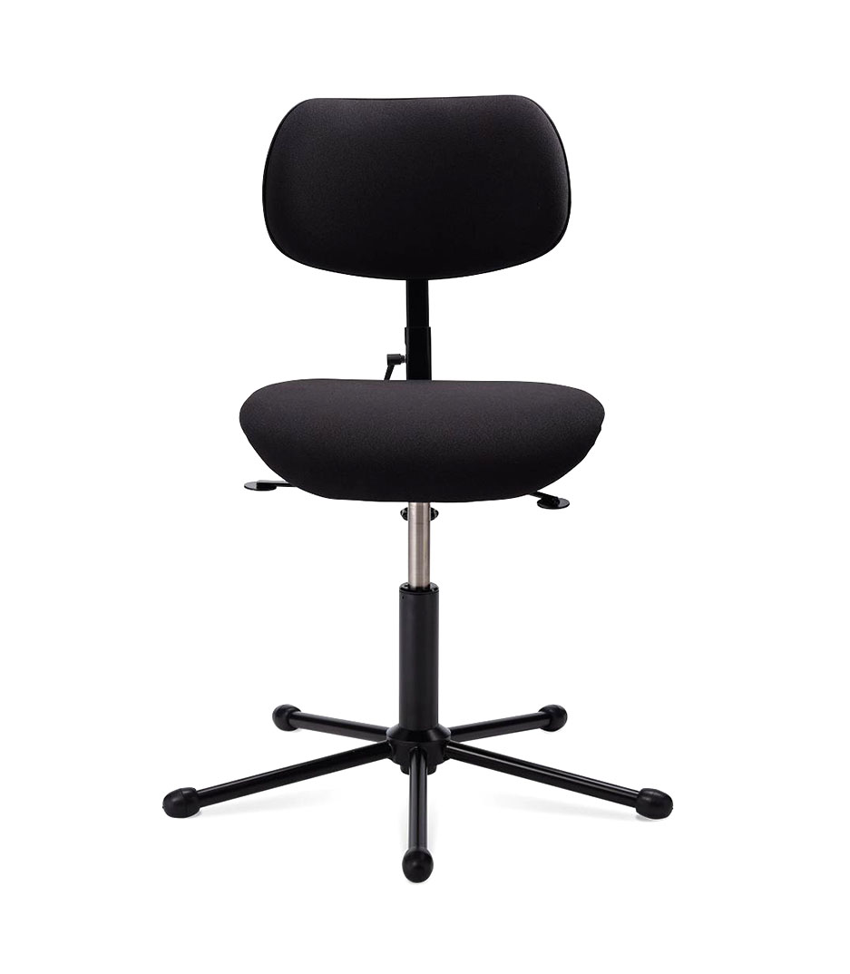 Five-legged star base, black or chrome. Seat height is adjustable. Position-tilting seat possible. Seat and backrest of laminated beech veneer come in natural or stained, finished with clear dd lacquer. In the upholstered seat version, ventilation holes are standard. Rubber fiber material for better comfort, foam at a nominal charge. Swivel seat (or non-swivel by request). Backrest is adjustable in height and angle and is upholstered with black rubber fiber material